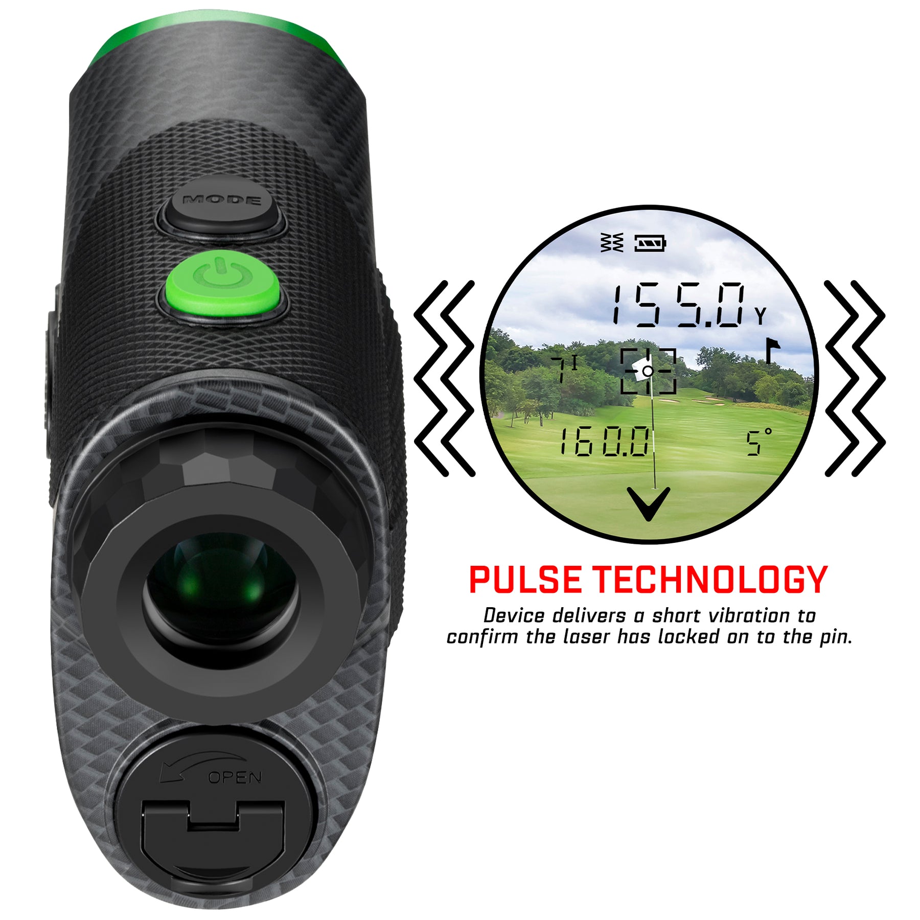 • Pin-Locking Technology: Our precise laser measure with Pin Acquisition Technology (P.A.T.) allows you to lock onto the pin up to 300 yards away; Pulse feature will emit short vibrating "burst" confirming your distance.